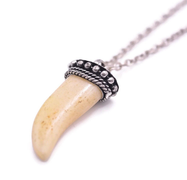 - Boho Style Classic Silver Plated Chain Necklace with Tooth Shaped Pendant Made from Buffalo Horn and Brass Details