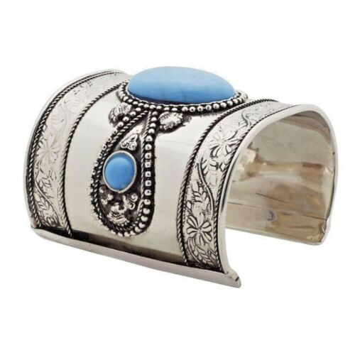 - Ornate Brass Cuff in Ethnic Floral Gauntlet Design Embellished with Blue Resin Cabochon Details - 2.5"